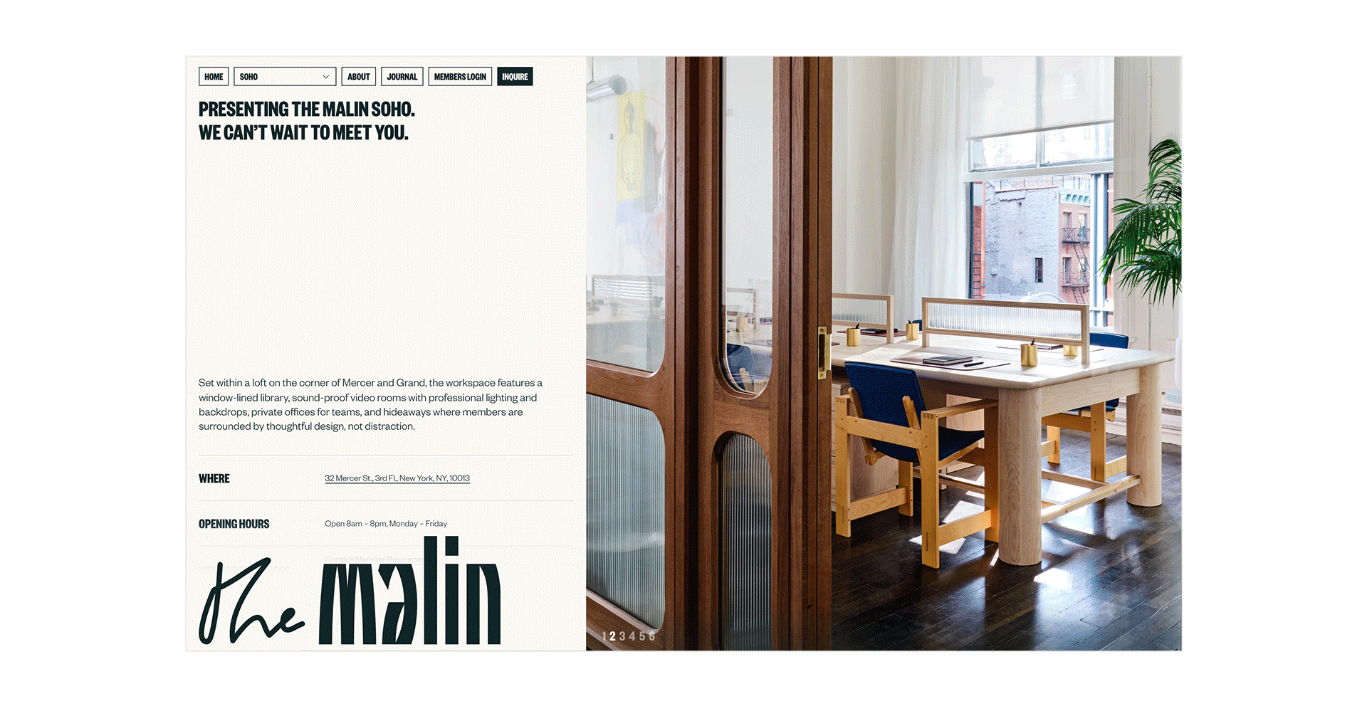 Design of the website for The Malin, new co-working spaces in New York.